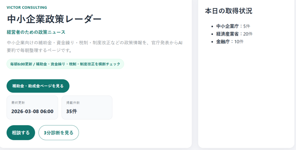VICTOR CONSULTINGでは、中小企業向け政策情報を整理するページ「中小企業政策レーダー」を公開しました。 このページでは、経済産業省中小企業庁金融庁などの新着政策情報を取得し、AIが要点を整理して表示します。 毎朝6時に自動更新されるため、その日... -