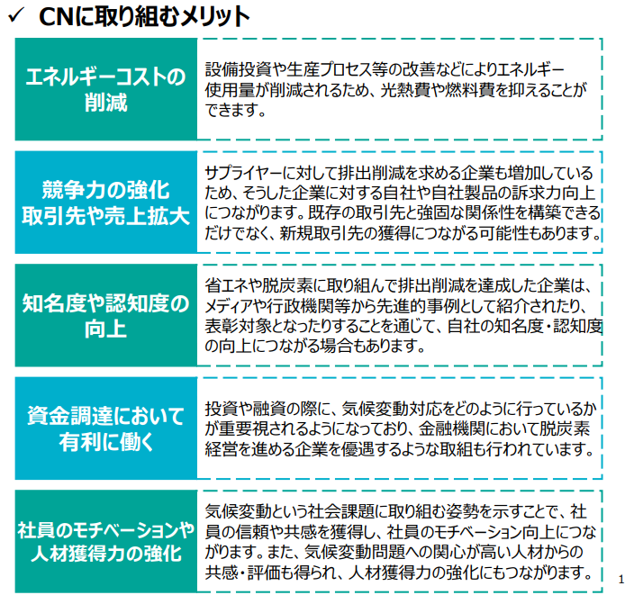 資料の冒頭に、中小企業がカーボンニュートラルに取り組むメリットを下図のように説明しています。