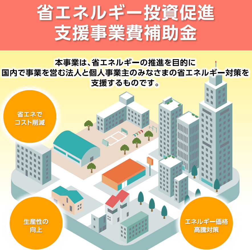 例えば、右図の省エネ補助金を活用して、エネルギー消費効率が高く、かつ、高性能な最新設備に更新することも検討します。最新設備への更新により、競争力の向上を図ります。