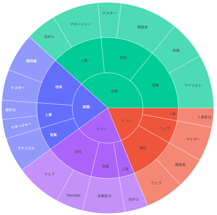 <何を表しているか> このチャートは、データを階層的に分類し、それぞれの割合や関係性を「同心円構造」で表したものです。中心から外に向かって階層が広がり、全体に占める比率や内訳が直感的に把握できます。ここでは、国別 → 部門別 → 職種別といった...