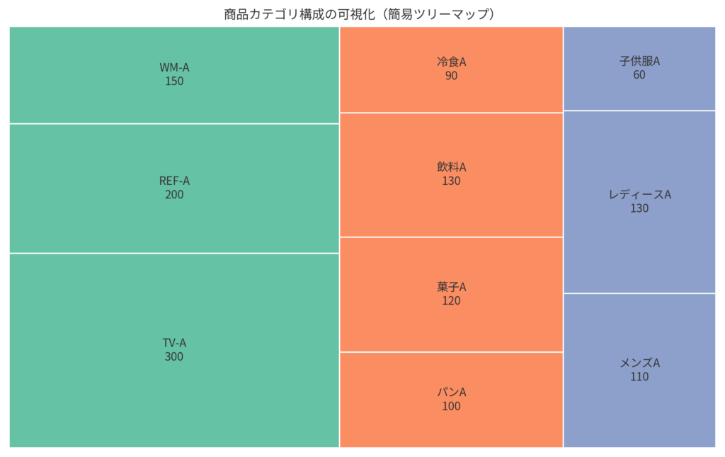 <何を表しているか> このチャートは、商品や部門などのカテゴリごとの売上や構成比を、長方形の面積によって可視化したものです。各長方形の大きさは数値(例:売上規模)に比例しており、複数カテゴリを一枚の図で俯瞰できるため、構成比の比較や重点領... -