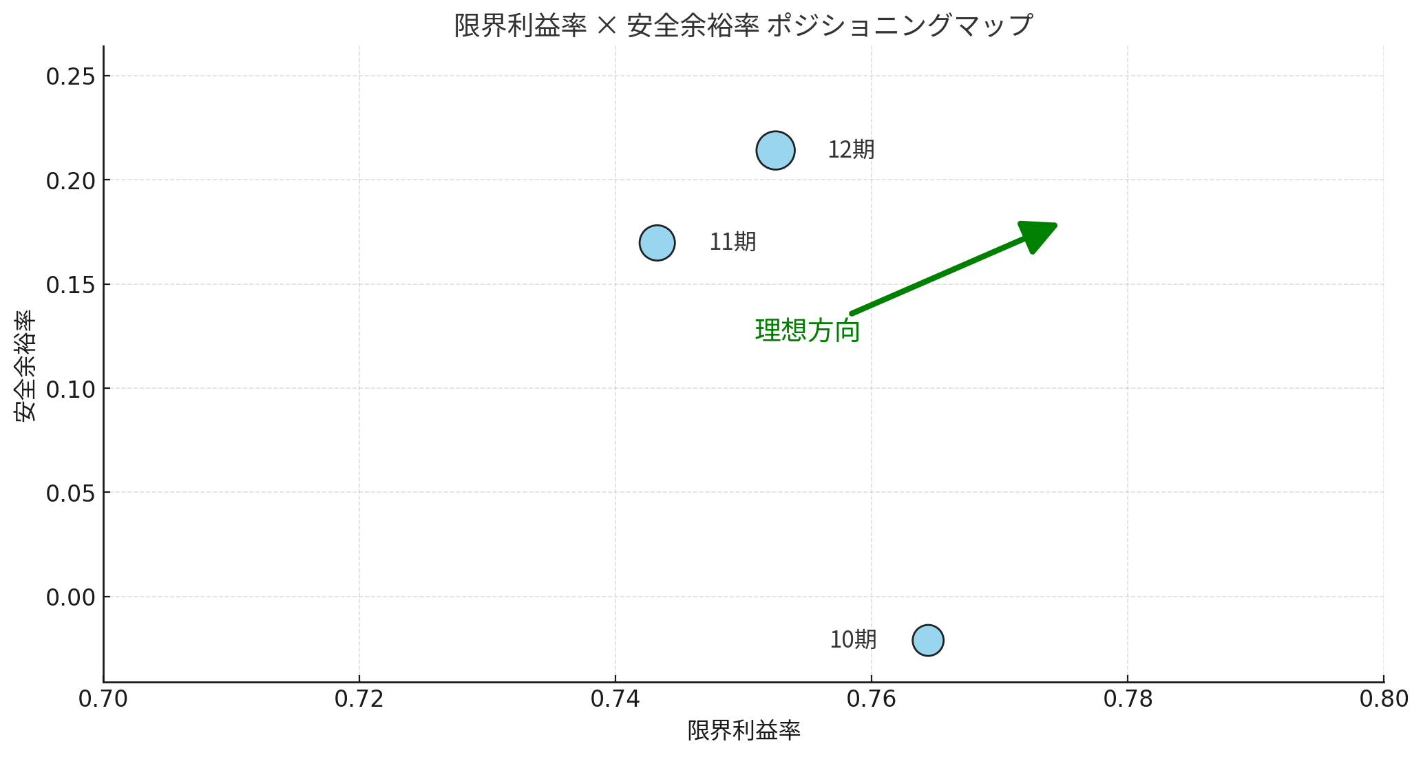 • 縦軸(安全余裕率):実際の売上が損益分岐点売上をどれだけ上回っているか。高いほど赤字転落リスクが小さい。