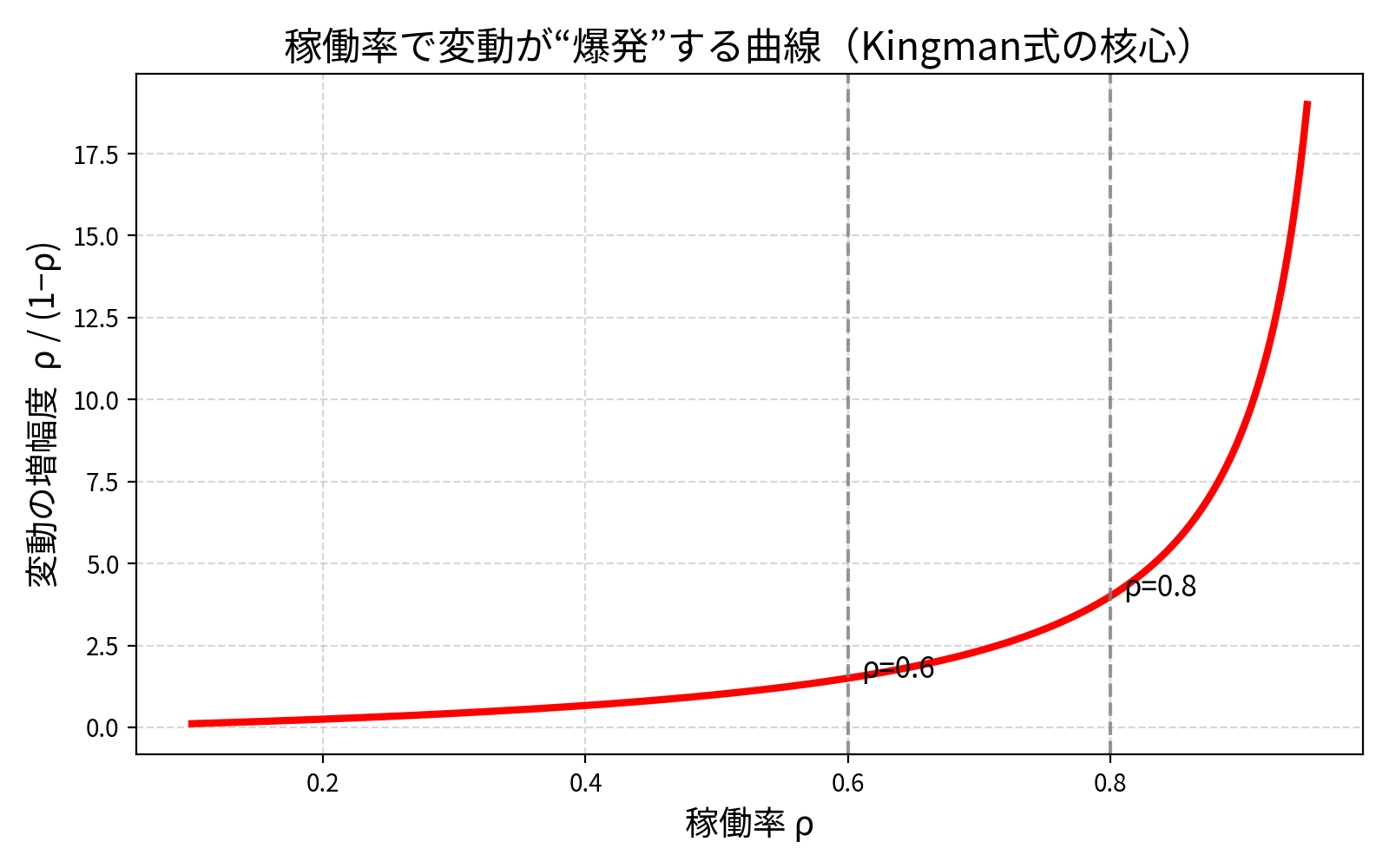 Factory Physicsと待ち行列理論(Kingman)が一致して示す、稼働率ρが変動を爆発的に増幅する自然法則を直感的に解説する。