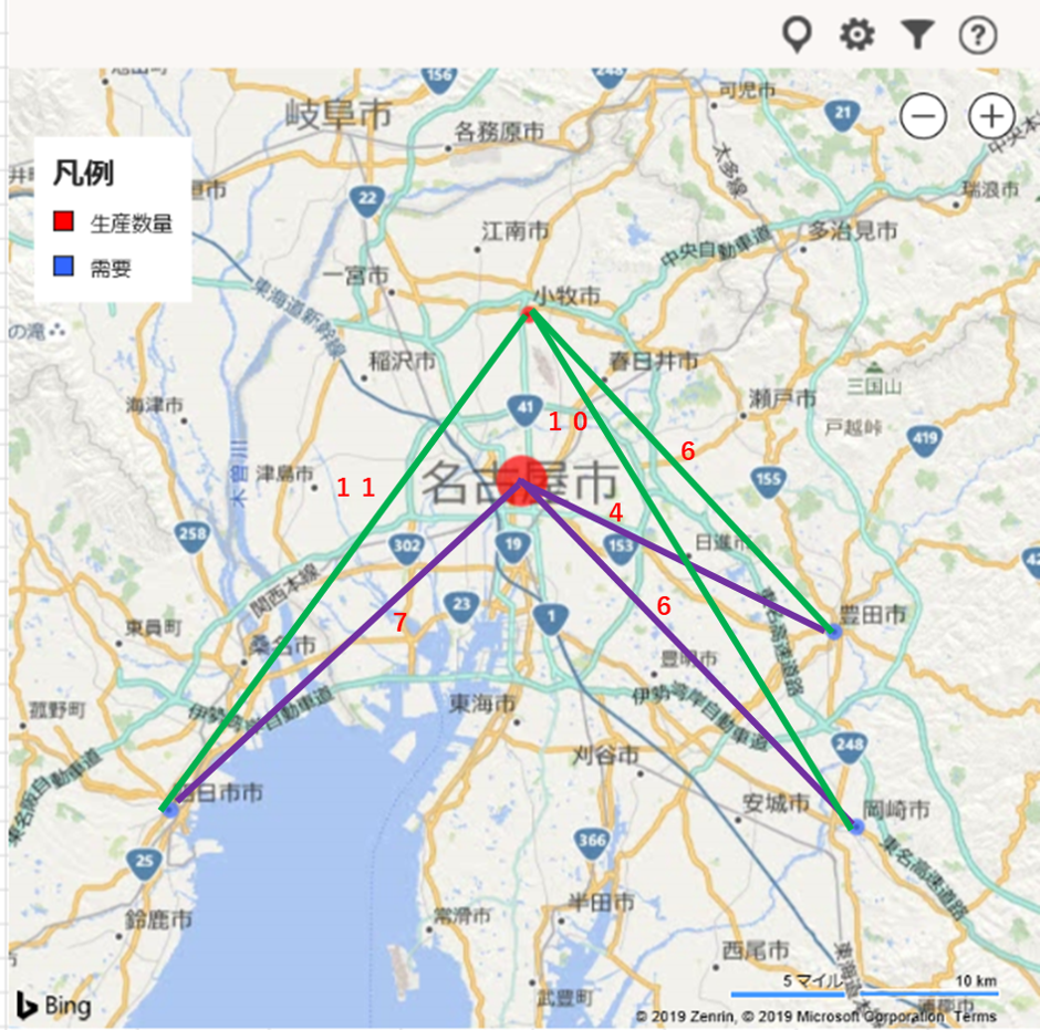 <簡単な事例>工場が名古屋市と小牧市にある。お客様の工場が岡崎市、豊田市、四日市市にあり、部品を輸送する。名古屋市の工場での生量量30個/日、小牧市の工場での生産量20個/日、お客様の需要が岡崎市が15個/日、豊田市が25個/日、四日市市が10個とし、輸送費が名古屋工場と小牧工場から各お客様の工場ごとへの輸送費が設定された場合の、総輸送費が最小となる輸送方法を求める事例。